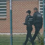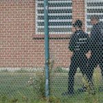 A number of security guards are at the former youth facility patrolling the inside of the fenced in area.