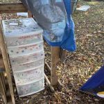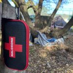 In certain areas of the encampment drug supplies litter the ground, but in one area there is a stand with a Naloxone kit on the side and a number of drawers with items listed on the drawers for condoms, tinfoil and straws, pipes, bubble pipes, and injection kits.