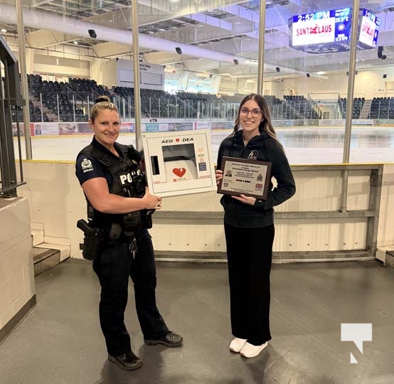 Cobourg Police Constable Jocelyn Hilts presents a defibrilator to Lyndsay Aitken, Manager, Recreation at the Cobourg Community Centre.