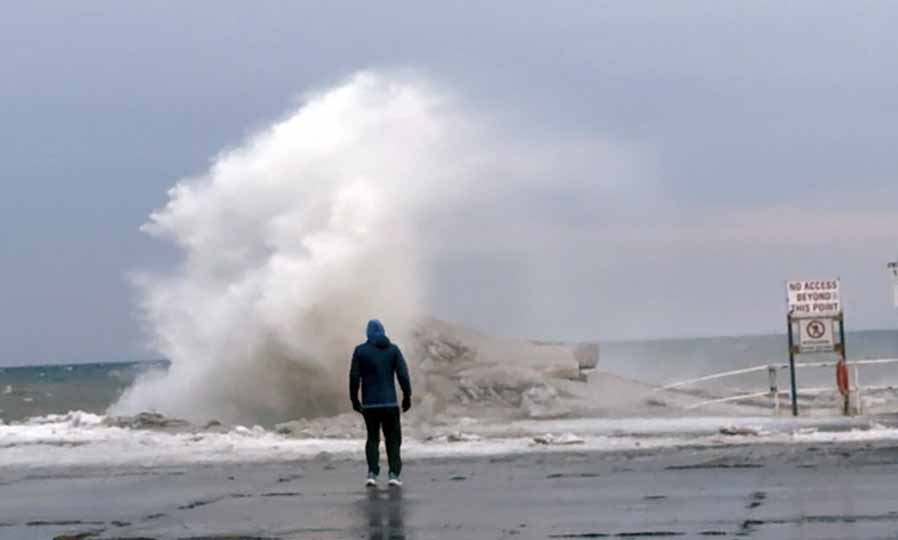 Along the lakeshore in Cobourg the high winds pounded the waves against the east breakwall shooting the water skyward.