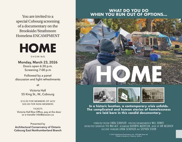 The Architectural Conservancy of Ontario – Cobourg and East Northumberland branch is pleased to present – HOME, a documentary on the Brookside Homeless Encampment