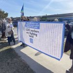 A giant banner with signatures of almost 7,000 LCBO workers were demanding a stop to the sell-off of the LCBO by the Ford government in the lead up to their new round of bargaining starting this week.